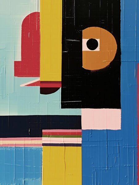 This abstracto petróleo pintura features bold geometric shapes and vibrant colors, creando a único visual experience. The composición includes an interplay of rectangles, squares, and circles, with colors ranging from fresco blues to cálido reds. Each forma is defined by grueso petróleo paint strokes, añadiendo textura and profundidad to the