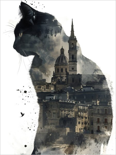This is a único and creativo piece of arte that shows a black cat intertwined with a blurry cityscape. The cat in the ink style is quiet and profound, as if it is buscando in the ciudad noche. The gris and white fondo adds to the mystery, haciendo personas immersed