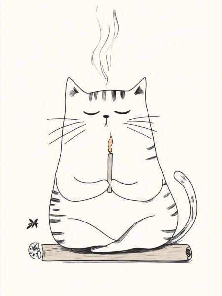 Un pequeño gato se sienta en meditación, sosteniendo una vela con los ojos cerrados. Las líneas simples y el fondo limpio transmiten serenidad, calma y una sensación de paz interior.