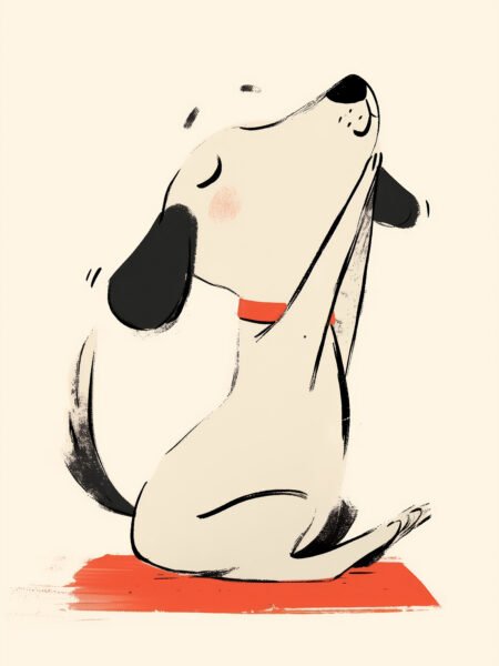 La ilustración minimalista muestra a un pequeño perro meditando con los ojos cerrados y las patas juntas. Las líneas suaves y el amplio espacio en blanco transmiten serenidad y calidez, creando una atmósfera relajante que invita a la calma y al descanso interior.
