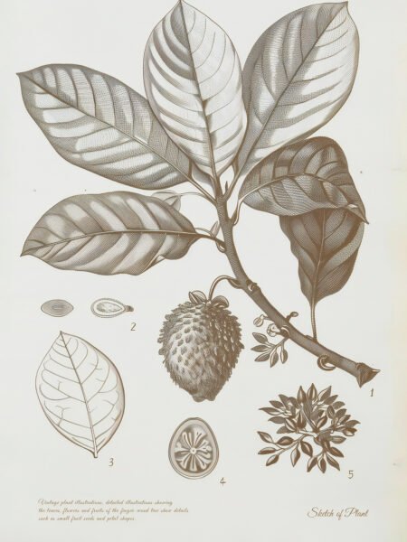 This image shows a detailed ilustración of a tropical plant, including sketches of the leaves, fruit, seeds, and the entire plant. This scientific ilustración precisely captura the plant's structure and features, providing a sentido of the fusion between scientific estudiar and natural aesthetics.