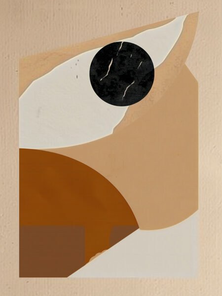 A minimalist abstracto geometric pintura in cálido beige and brown tones, accented with a black circular element. The lines are simple and the composición is suave, transmitiendo a sentido of tranquilidad and equilibrio. Perfecto for moderno interior decor, añadiendo a touch of artístico flair and spatial profundidad.