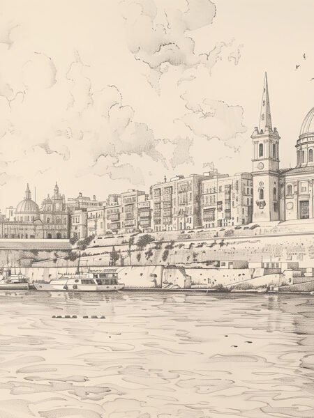 This exquisite sketch hermosamente captura the costa and clásico arquitectura of Malta, mostrando the fusion of tradicional arte and natural beauty. The con cúpula iglesia and pointed spires stand solemnly, detailed in fino lines, while the cielo behind is adornadas with delicados nubes and volando pájaros, añadiendo a dinámico sentido