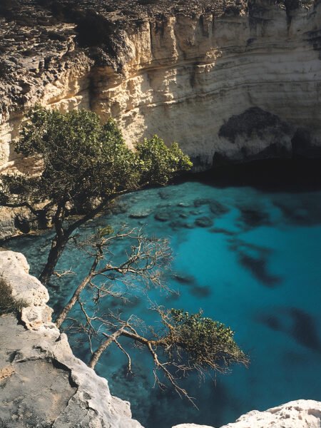 The Maltese Blue Grotto, with its deep lago resembling a sapphire, contrasts sharply with the surrounding rocks and trees. It is a secretive and serene haven of naturaleza.