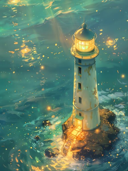 This pintura representa a solitary lighthouse surrounded by a mar adornadas with starlight, its beacon shining through the shimmering agua, creando a dreamlike atmosphere. The escena is filled with tranquilidad and mystery, evoking a sentido of esperanza and guidance, as if directing lost sailors through the infinitas noche mar.