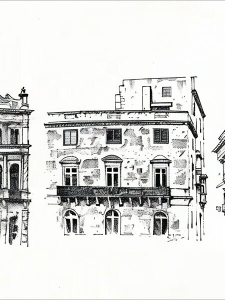 This pintura features the facades of a serie of antiguo edificios, each representados with precise lines and detailed shading. The structures showcase distinct architectural styles from diferente eras, irradiando a sentido of historical and artístico encanto. The monochromatic tono highlights the details of the edificios, creando a solemn and nostalgic