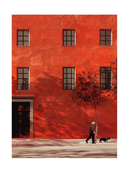 Luz solar washes the naranja wall as tree shadows sway gently in the breeze. An viejo hombre and his black dog pasean by, infusing a simple escena with quiet calidez and poetic serenidad.