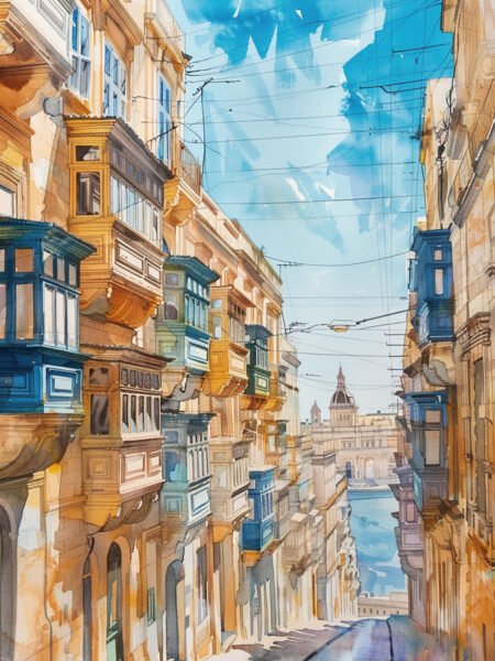 In Valletta'ss Calle Encanto: A Vivo Acuarela Reverie", watercolors venir vivo on the paper, depicting the único encanto of Valletta's streets. The interwoven vibrant colors seem to contar the antiguo stories and embody the vivo soul of the ciudad. Luz and sombra flow among the edificios, añadiendo a dreamy textura