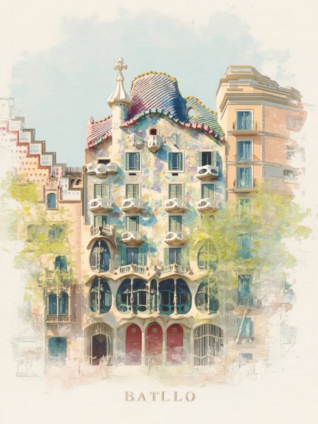 Pinceladas de acuarela dan forma a las texturas de la Casa Batlló, con tonos azules, rosas y verdes mezclándose como seda fluida. Ventanas arqueadas, balcones escultóricos y árboles frondosos se entrelazan, y la luz cálida hace palpitar la fusión de arte y naturaleza.