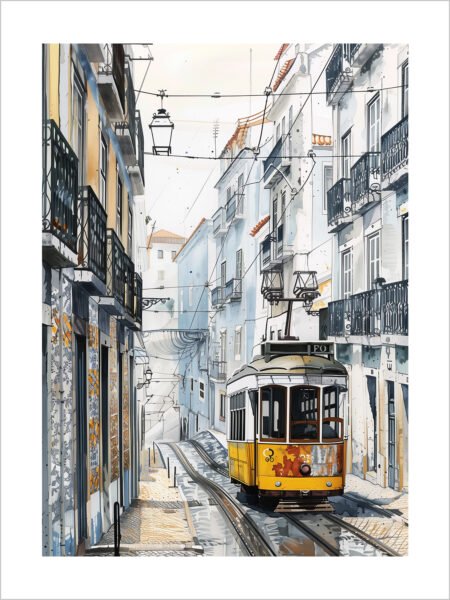 This pintura representa a yellow tram viajando through a estrecho ciudad calle, flanqueados by alto edificios and balcones, with lights hanging overhead. The escena conveys a vintage urbano atmosphere and a sentido of tranquilidad.