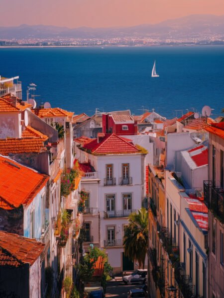 La escena muestra el barrio antiguo de Lisboa con edificios de tejas rojas y paredes blancas, un velero en el mar, y montañas distantes bajo un cielo neblinoso. La luz matutina baña la vista en tonos cálidos, creando un ambiente sereno y tranquilo.