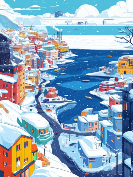 Esta ilustración presenta la impresionante escena de un pueblo costero en invierno. Las casas cubiertas de nieve están dispuestas de manera pintoresca, con caminos sinuosos atravesándolas. El mar de color azul intenso brilla, salpicado de barcos, y los copos de nieve que caen crean una atmósfera serena y romántica.
