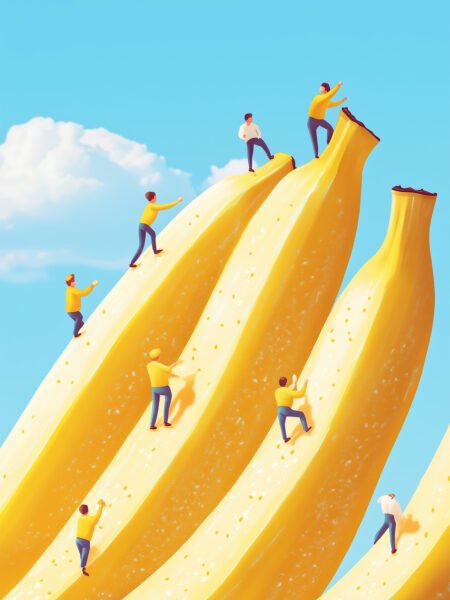 Bajo un cielo claro, enormes plátanos se transforman en colinas doradas. Pequeñas figuras los escalan con entusiasmo, creando una escena lúdica y surrealista. Los colores cálidos y las proporciones exageradas transmiten alegría, cooperación y una sensación de aventura ligera y optimista.