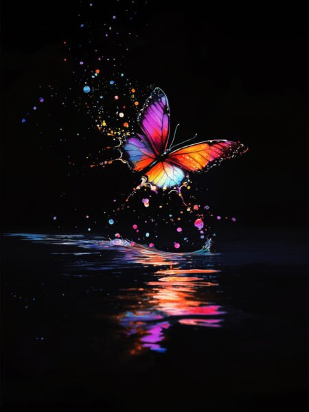 En la imagen, una mariposa de colores brillantes se mueve con elegancia contra un fondo negro. Chorros de color la rodean, y el hermoso reflejo de la mariposa se muestra en el agua abajo, llena de sentimientos soñadores y vivaces.