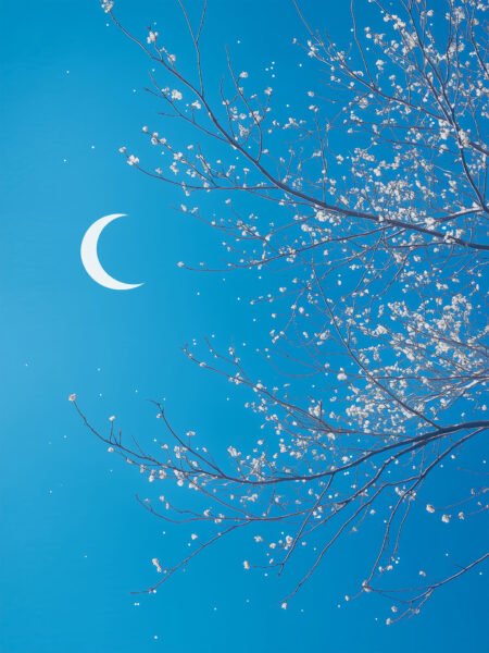 ‌En la imagen, una luna creciente cuelga alto en el cielo nocturno azul profundo y las ramas cargadas de flores blancas se extienden. Tranquila y hermosa, crea un ambiente romántico y pacífico, agregando un toque poético al hogar.