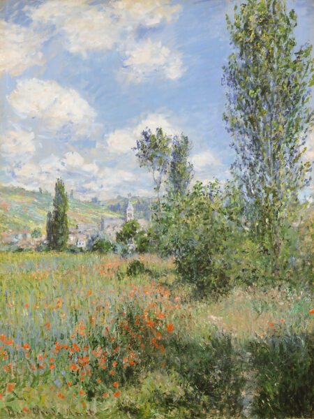 La obra de Monet "El camino a Vétheuil" representa un camino rural sinuoso bordeado de flores en flor y frondosos árboles, con el pueblo de Vétheuil apenas visible al fondo. A través de sus colores suaves y pinceladas fluidas, la pintura transmite una escena pastoral tranquila y apacible, evocando una