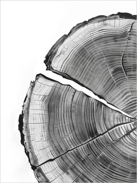 Between black and white lights and shadows, the annual rings are clearly visible, engraved with the imprint of tiempo. The varying widths and depths of the rings narrate the passage of tiempo and the ritmo of naturaleza. The delicados bark textura is rich in layers, almost tangible to the touch,