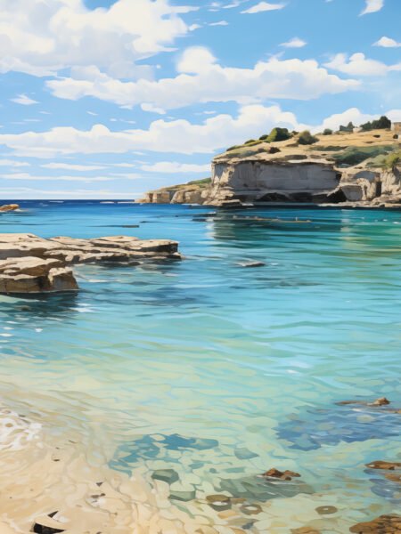 The crystal-clear blue agua reveals the rocks beneath and the reflejos of colorful barcos floating gently on the surface. The rocky cliffs along the costa are bathed in luz solar, mejorando their grandeza. The white nubes in the cielo contraste hermosamente with the blue of the mar, creando a serene