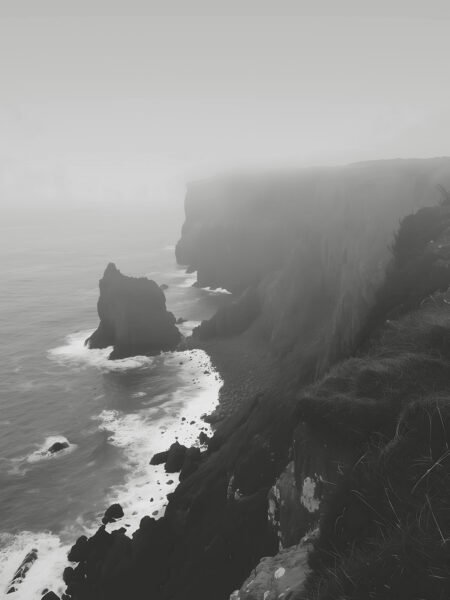 This picture representa a steep costa shrouded in grueso fog. The crashing waves contra the cliffs evoke a sentido of desolation and tranquilidad. The black-and-white tones add a touch of mystery and deep emoción to the escena.