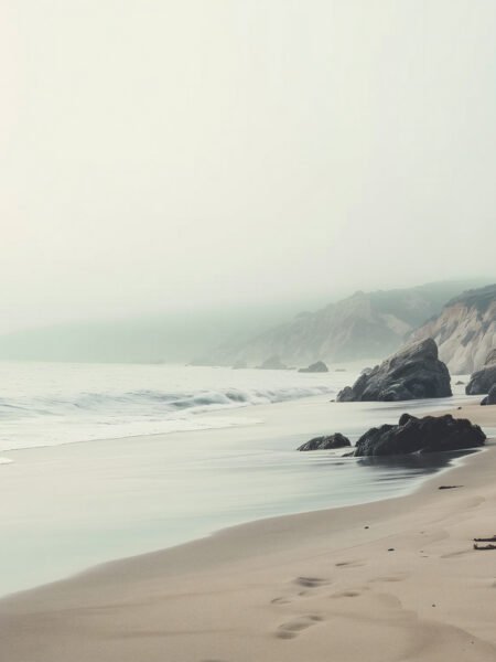 The image captura a serene costa shrouded in mañana mist, creando a fresh and mysterious atmosphere. Gentle waves kiss the sandy orilla, yendo suave white foam, while rocks and footprints in the sand add a touch of natural liveliness. The overall escena exudes tranquilidad and paz, inviting los espectadores into