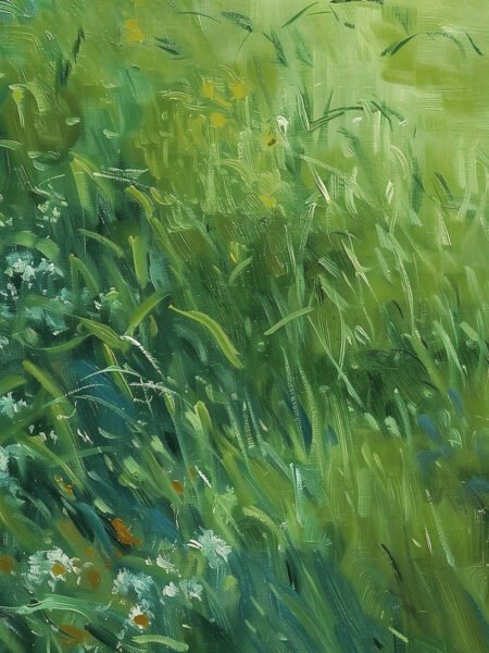 This pintura representa a exuberante green meadow, dotted with sporadic white flowers, evoking a sentido of natural freshness. The rich green hues and delicados brushstrokes portray the gentle swaying of the grass in the breeze, almost letting you smell the fragrance of the meadow. The overall tono of the pintura