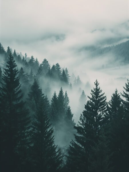A montaña pine bosque is enveloped in grueso fog, creando a mysterious and serene atmosphere. The outlines of the trees are faintly visible through the mist, formando a dreamlike natural escena. The interplay of suave greens and whites showcases the purity and beauty of naturaleza. The entire image evokes a