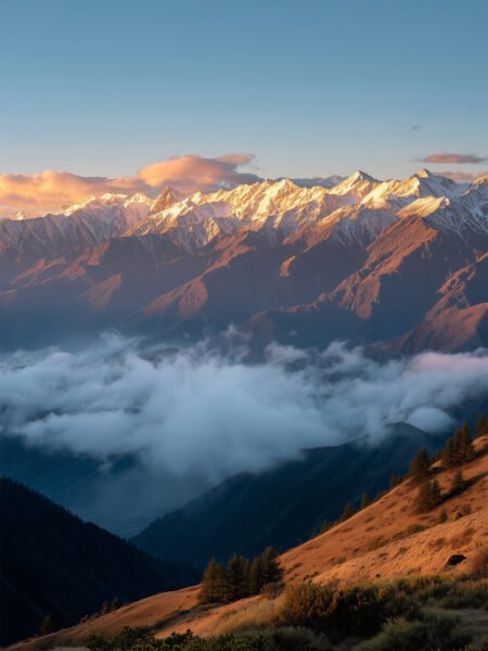 En esta pintura decorativa, las magníficas montañas brillan con luz dorada - anaranjada en el resplandor del sol poniente. Nubes se posan entre ellas, como si contaran la grandeza de la naturaleza.
