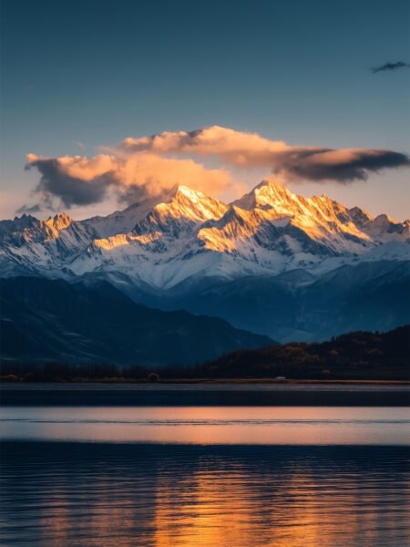 Esta pintura muestra la espléndida vista del Monte de Nieve Meili bajo la luz del sol. Los majestuosos picos nevados están iluminados por la luz dorada del sol, reflejándose hermosamente en la superficie del lago. Con nubes esparcidas en el cielo, la pintura ofrece ricos estratos de color, evocando una