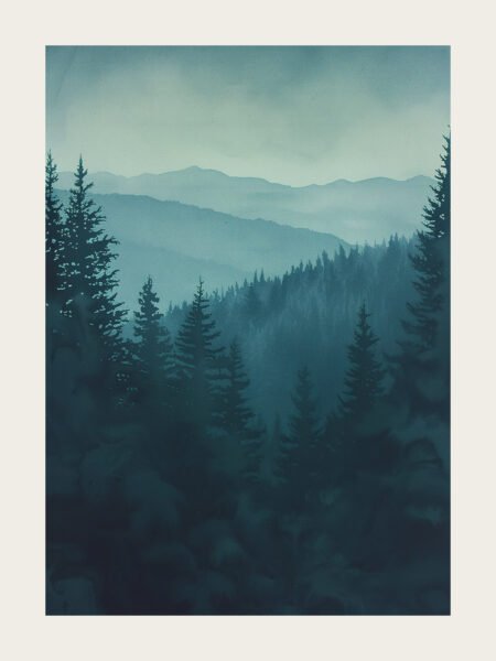 Layer upon layer of montaña ranges emerge through the delgado mist, with the silhouettes of pine trees outlining the tranquilidad and grandeza of naturaleza. The blue-green tones of the pintura crear a serene and mysterious atmosphere, as if entering a distante and peaceful sueño.