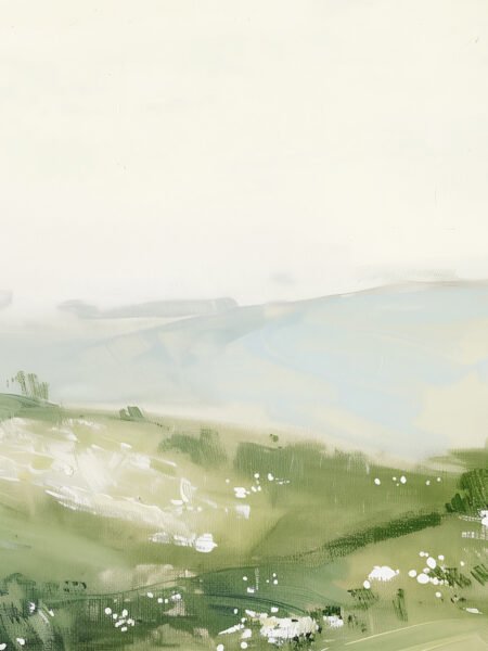 This petróleo pintura representa a serene meadow escena enveloped in mañana mist, irradiando a tranquil and mystical atmosphere. The suave green tones dominate the lienzo, creando a lively and vibrant natural paisaje. Distante mountains are faintly visible through the mist, evoking a sentido of profundidad and expansiveness. The artist's delicados