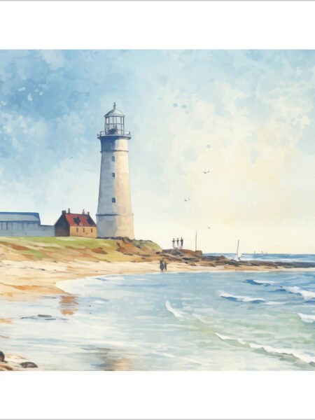 On a tranquil seaside, a lighthouse stands alto at the terminar of the sandy playa, guiding passing ships. The brillante blue cielo blends with the cálido luz solar, and gentle waves lap the orilla. The pequeño casa beside the lighthouse and the distante veleros add to the serenidad and beauty,