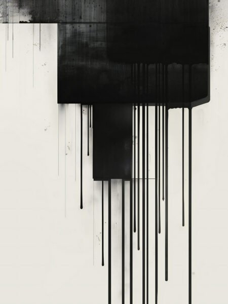 This abstracto pintura, dominated by black and white tones, showcases the dripping effect of black blocks extending downward from the parte superior of the lienzo. Black paint flows from the edges of the blocks, formando vertical lines that suggest a continuous spread of darkness. The blank espacio on the izquierda