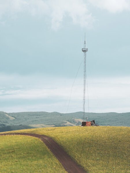 This image features a solitary signal torre de pie alto on a vast plateau, with yellow meadows contrastando contra distante mountains. It evokes a sintiendo of solitude yet esperanza, as the torre symbolizes moderno civilization quietly safeguarding this serene paisaje amidst the peaceful expanse of naturaleza.