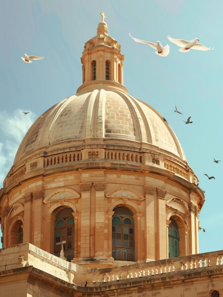 This photograph captura the majestic dome of a iglesia, de pie solemnly and sacredly contra the blue cielo. Several white doves soar above the dome, simbolizando paz and esperanza. The architectural details of the iglesia are exquisite, with intrincados carvings that exude a sentido of historical weight. Luz solar bathes