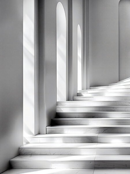 This image features a pristine white staircase bathed in luz solar streaming through the windows, creando hermoso luz and sombra effects. The entire escena exudes a sentido of tranquilidad and purity, as if leading to a sacred realm.
