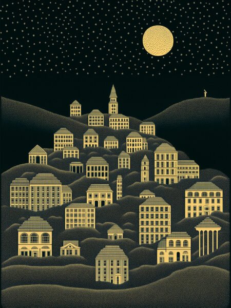 Esta pintura decorativa muestra la belleza serena de una ciudad de montaña bajo la luz de la luna, con edificios dorados brillando contra las montañas oscuras y el cielo nocturno, mientras que las estrellas parpadeantes añaden un toque de ensueño.