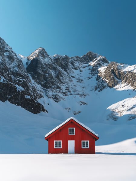 Entre montañas cubiertas de nieve, una pequeña casa roja descansa en silencio. El cielo gris y el paisaje amplio refuerzan la calma y la soledad, mientras la cabaña aporta calidez, evocando refugio, fortaleza y la huella humana en la naturaleza.
