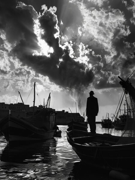 Amid the dim harbor, a solitary figura stands still, gazing at the interplay of nubes and luz. Barcos and nets frame the everyday escena, yet the solitude infuses the image with poesía and contemplation.
