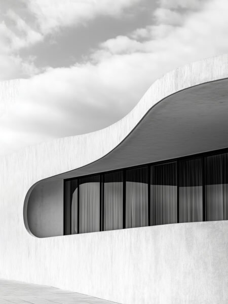 La fachada ondulante se eleva suavemente bajo el cielo, combinando blanco y sombras profundas. La escena transmite serenidad, equilibrio y una elegancia moderna marcada por la pureza de la forma.
