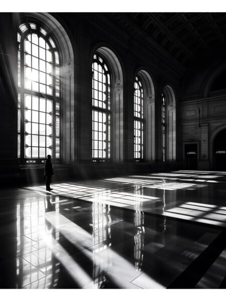 The black-and-white photo shows a spacious interior clad in marble, with arched windows dividing the espacio and letting in suave luz. On the izquierda, a persona stands quietly from behind, seeming to be deep in pensamiento. The whole escena is quiet and solemn, lleno of tranquilidad and profound atmosphere.