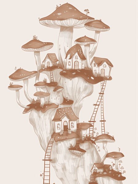 This illustration-style artwork representa a whimsical mushroom aldea. Alto mushrooms serve as houses, completo with diminuto doors, windows, and winding ladders, creando a fairy tale-like mundo. The cálido brown tones add a sentido of comfort and fantasy, as if guiding the viewer into a mysterious and serene bosque dwelling. The
