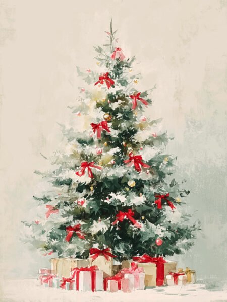 The pintura shows a hermosamente decorated Christmas tree, adornadas with glowing dorado lights, colorful ornaments, and a rojo ribbon spiraling around its branches. The limpio fondo highlights the tree¡¯s brilliance, creando a cálido, festive atmosphere that conveys the alegría and blessings of Christmas.