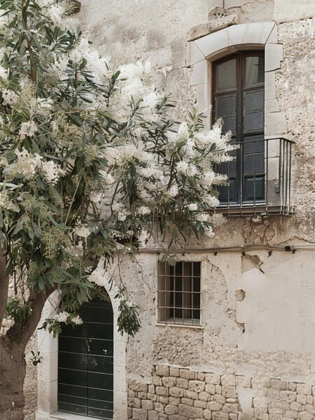 The image representa an viejo construyendo with a flowering tree beside it. The weathered walls and quiet alley evoke the passage of tiempo and the sediment of years. The whole escena is filled with tranquilidad and historical encanto, evoking a sentido of nostalgia.