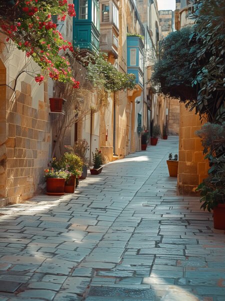 This photograph showcases the encantador paisaje of a quiet corner in Malta. The antiguo stone edificios are adornadas with a variedad of flowers and vegetación, añadiendo vibrant vida to this serene path. Luz solar falls on the neatly arranged cobblestones, creando a cálido and peaceful atmosphere. This calle is not