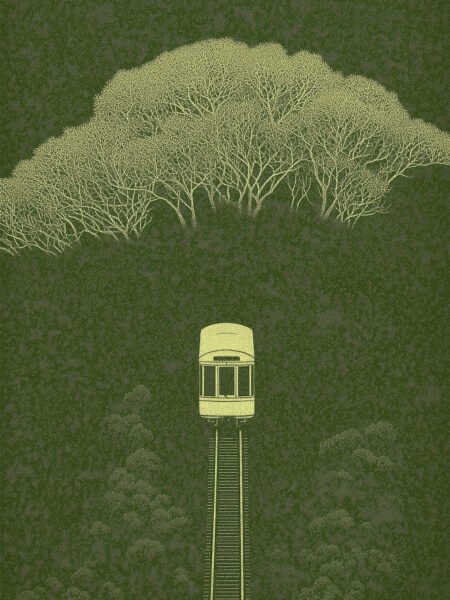 Esta pintura decorativa utiliza el verde oscuro como fondo, con un árbol frondoso ocupando la mitad superior, sus ramas y hojas representadas con delicados puntos. Abajo, un teleférico viaja verticalmente a lo largo de una vía, como si recorriera un reino onírico lleno de verde, sereno y poético.