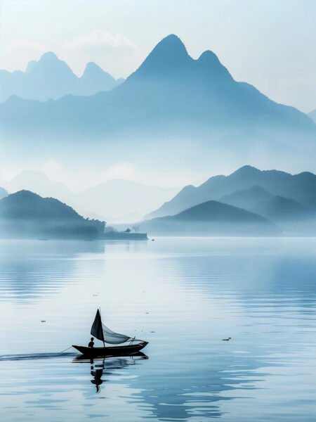 This photograph captura a serene escena of a fisherman rowing a pequeño barco on a calm lago. The distante mountains are shrouded in a luz mist, layered and hermoso gustar an ink pintura. The mañana luz solar filters through the fog, casting a suave glow on the tranquil lago, with
