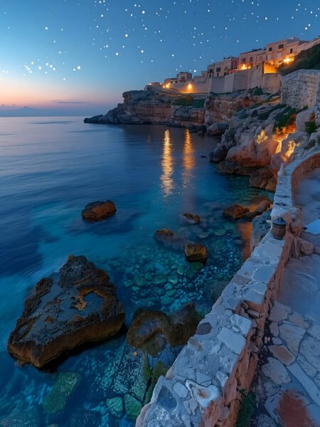 The picture shows a peaceful and mysterious seaside noche escena, with the deep blue mar and stars complementing each other, and the rocky costa haciendo it even más tranquil. A row of houses sits on a cliff, illuminated by cálido lights. , as cálido as a sueño, the whole escena