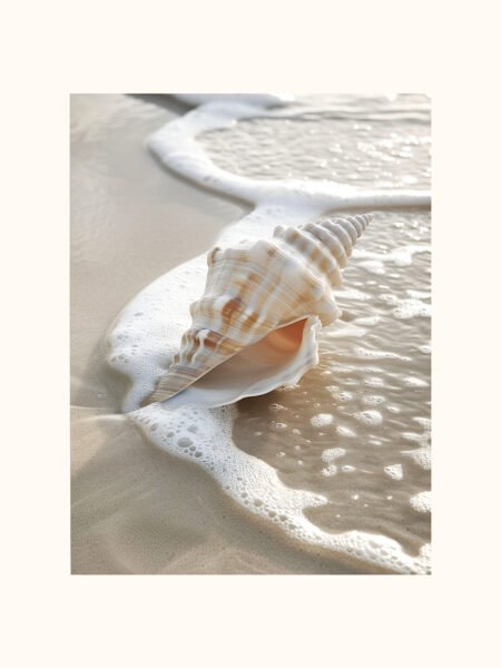 This photograph showcases a hermoso seashell descansando quietly on the playa, with gentle waves caressing the shell and the sand. The shell's delicados textura and suave colors perfectly blend with the natural hues of the mar and the playa. Luz solar glistens on the shell and the foam, reflecting a
