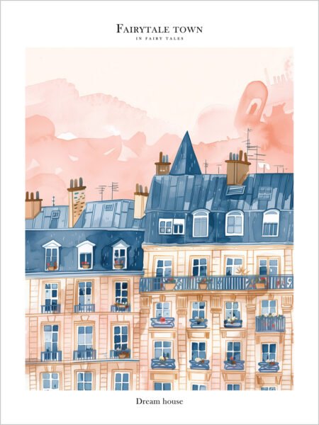This is a watercolor-style ilustración depicting a portion of a construyendo imbued with the atmosphere of Paris. The blue roofs intertwine with the pink puesta de sol, formando a hermoso tableau that endows the escena with a romantic ambiance, as if behind each ventana lies a captivating historia. Here, tiempo