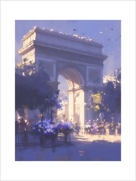 This pintura representa a magnífico Arc de Triomphe surrounded by vibrant flowers, creando a romantic atmosphere. The suave purple and blue hues add a dreamy touch to the image. Cálido and gentle luz in the fondo illuminates the Arc and the surrounding trees and edificios, with the details of the